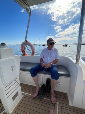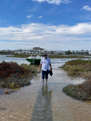 Nach dem Einchecken sind wir noch an den Strand gegangen. Dieser ist nur mit dem Boot über die Lagune zu erreichen. Um auf das Boot zu gehen, musste man ein paar Schritte durch's Wasser waten. So musste ich Schuhe und Socken ausziehen und die Hosen hochkrempeln. Auf unsere Frage, ob es jetzt hier Flamingos habe, hat uns der Bootsführer einen Ort in Tavira angegeben, den wir dann morgen noch besuchen wollen.