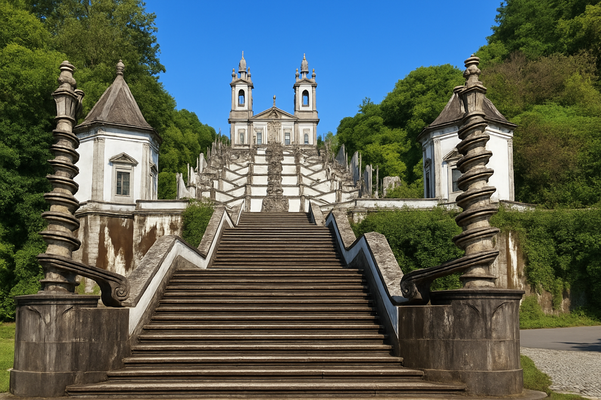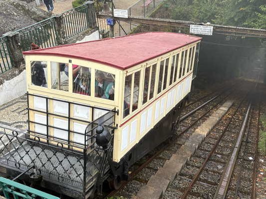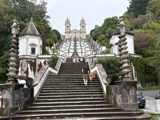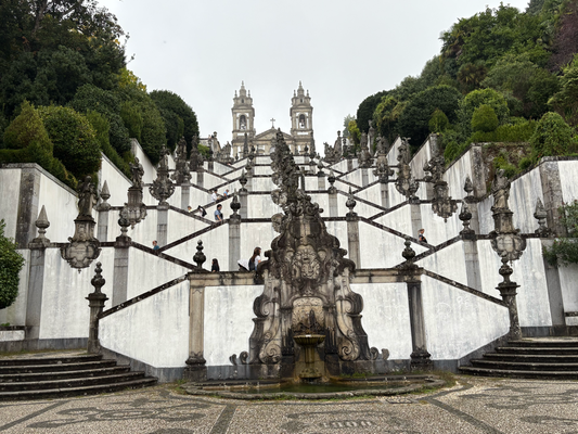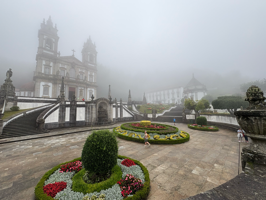 Von unserer Nobelunterkunft im Palast, mit einem wiederum sehr guten und reichhaltigen Morgenessen sind wir heute zuerst zum Santuário do Bom Jesus etwas ausserhalb von Braga gefahren. Das Wetter wollte nicht so recht, es hatte viel Nebel dort und nieselte leicht. So sind wir mit dem Elevator do Bom Jesus - einer Drahtseilbahn - hinauf zu der Klosterkirche gefahren. Nach dem Besuch der Kirche hat uns auch der Souvenirshop sehr interessiert. Ich habe mir dort ein Buch über die Sehenswürdigkeiten von Portugal gekauft.
