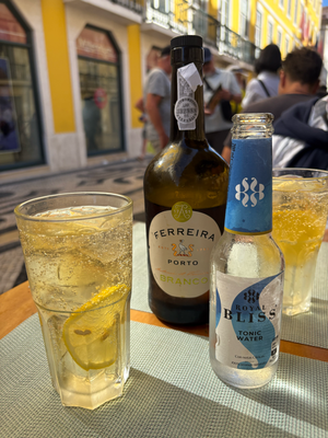 Wir sind zu Fuss abgestiegen und dann durch den Arco da Rua Augusta gegangen, wo wir in einer Strassenkneipe einen ersten Porto Tonic genossen.