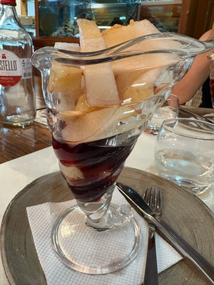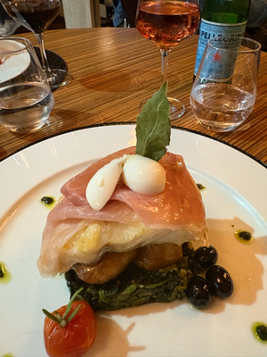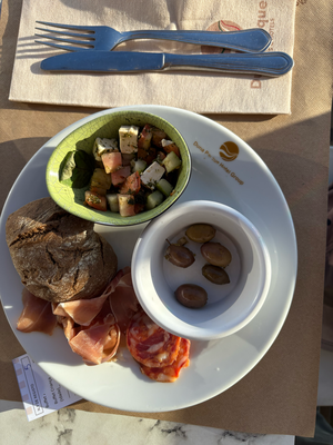 Dann ging es zurück auf die andere Flussseite, wo wir in einem Gartenrestaurant ein sehr feine Fleischplättchen und einen Porto Tonico (weiss und rosé) bestellt haben.