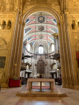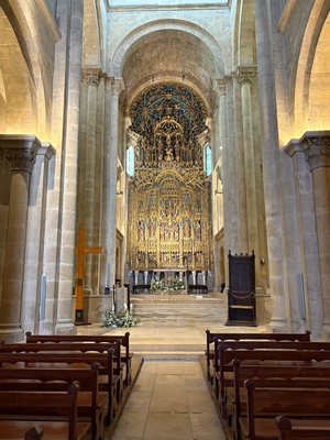 Von hier ging es dann, vor allem über Autobahnen, weiter nach Coimbra, wo wir die alte und die neue Kathedrale besuchten. Zwei eindrückliche katholische Kirchenbauten. Ebenfalls einen Besuch statteten wir der Universität von Coimbra ab. Auch diese ist in altehrwürdigen und reich geschmückten Bauten untergebracht. Nach einem kurzen Stadtrundgang ging es dann wieder weiter zu unserem heutigen Übernachtungsort Costa Nova do Prado. Unterwegs haben wir sogar einige Flamingos gesehen. (Diese sind uns bereits in Tavira „versprochen“ worden - dort hatten wir kein Glück.) Nach ein paar Tagen im Landesinneren sind wir heute wieder am Meer angelangt. Auch hier sind wir über die vorhandenen Boardwalks dem Meer entlang spaziert. Auf dem Rückweg haben wir die neue Kirche besucht. Hier haben mir, neben dem im Vergleich zu den alten Kirchen eher schlichten Innenraum, vor allem die Buntglasfenster sehr gut gefallen.
